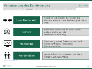 Ein weiterer, direkter Vorteil beim Engagement im Social Web ist die Verbesserung des Service gegenüber dem Kunden. Wir haben vier wichtige Punkte aufgegriffen – Unmittelbarkeit, Service, Monitoring und Kundennähe – welche sich direkt auf die Kundenzufriedenheit und die Markenwahrnehmung auswirken.