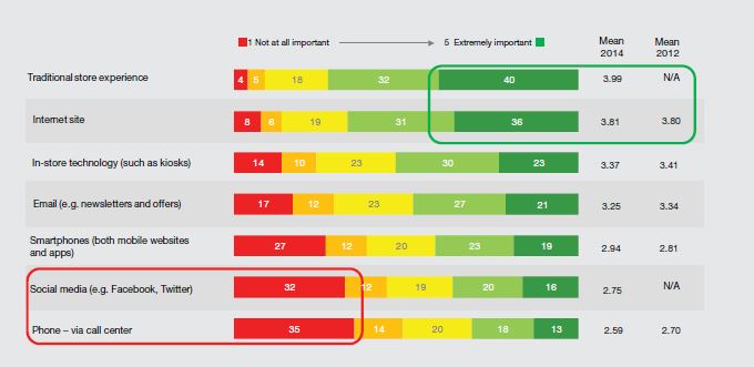 Insgesamt erachten 72 Prozent der weltweit Befragten physische Läden für wichtig. Gleichzeitig aber sehen 75 Prozent das Internet als Entscheidungsvorbereiter. 29 Prozent haben gar keine Probleme damit, ihre Daten dem Retailer zu überlassen. Beim Einkaufsvorgang selber hängen die Läden die digitalen Kanäle - und hier besonders die sozialen Medien - deutlich ab, nur das Telefon ist als Verkaufskanal noch unwichtiger: 40 Prozent bezeichnen Läden als extrem wichtig für Kauf und Bezahlung, soziale Medien kommen auf eine Zustimmung von 16 Prozent. Soviel zum Thema F-Commerce. Der traditionelle Web-Auftritt des Unternehmens folgt dem Laden aber auf dem Fuße (36 Prozent).