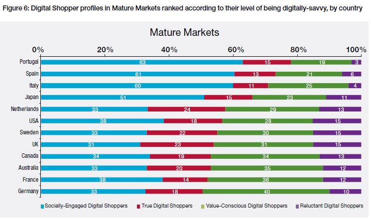 Aus den Antworten destillierten die Autoren insgesamt sieben unterschiedliche Verbraucherprofile. Für die entwickelten Märkte ermittelten die Studienautoren vier Käuferprofile: 19 Prozent "True digital shoppers" und 41 Prozent "socially engaged digital shoppers" nutzen für weite Teile der Einkaufsreise digitale Kanäle, sowohl bei der Vorbereitung als auch beim letztlichen Kauf. Sie nutzen Apps, erkundigen sich in Social Media und Web, suchen Produktinformationen und befragen Preis-Vergleichsportale. Ihnen gegenüber stehen 29 Prozent "value-conscious shoppers". Sie bevorzugen beim Einkauf das Ladengeschäft, nutzen aber durchaus das Internet als Teil des Einkaufprozesses. Der Anteil der Digitalverweigerer ("reluctant digital shoppers") liegt bei 11 Prozent. Südeuropa ist bei den Digital-Affinen vorne. Deutschland weist den geringsten Anteil aus; kommt aber auch auf immerhin 52 Prozent.