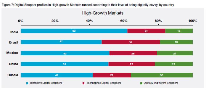 In BRIC+Mexiko wurden drei Käufertypen identifiziert: 50 Prozent "interactive online shoppers", 17 Prozent "technophile digital shoppers" und 23 Prozent "digitally-indifferent shoppers", die wenig auf digitale Kanäle geben. Russland liegt am Ende des Feldes und wirkt schon beinahe wie ein reifer Markt mit immerhin 36 Prozent Konsumenten, die wenig mit Internet & Co. anfangen können.