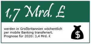 1,7 Mrd. Pfund werden laut dieser Studie wöchentlich (!) über mobile Apps transferiert, das klassische Online-Banking schiebt im gleichen Zeitraum 6,4 Mrd. Pfund durch Netze und Rechner. Die heutigen insgesamt 8,1 Mrd. sollen bis 2020 auf 12,8 Mrd. Pfund anwachsen, wobei der kabellose Beitrag auf das Doppelte anschwellen (3,4 Mrd. Pfund) wird. Genauso wie die Nutzerbasis für das mobile Banking: von 17,8 Mio. Briten auf 32,6 Mio.