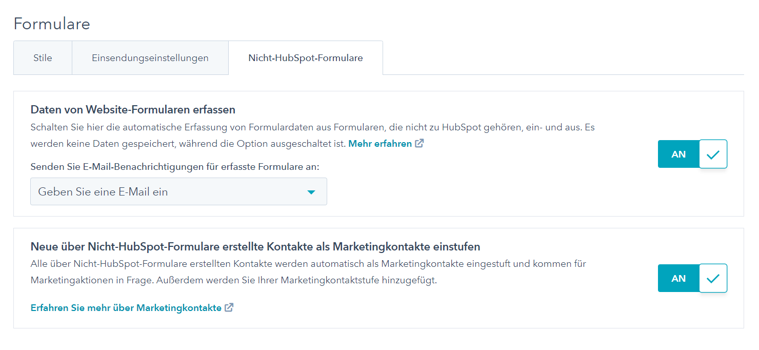 Bei nicht-HubSpot Formularen muss in den Account Einstellungen > Marketing > Formular > nicht-HubSpot Formular der Regler für die automatische Marketing Kontaktzuweisung aktiviert werden