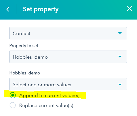 Für die Pflege von Listen, lässt sich das mit einem einfach WF machen. Sagen wir die Liste heißt 'Webinarimport' und Paul ist Teil dieser Liste. Seine bisherhige Ausprägung war 'Tanzen', im Webinar ging es aber um Singen, dementsprechend sollen alle Leads, die daran teilgenommen haben, die Ausprägung 'Singen' erhalten. Anstatt jetzt also die Liste zu Öffnen und über einen Bulk allen 'Singen' zuzuweisen, erstellst du einen WF der die Aufnahmebedingung hat 'Ist Teil der Liste Webinarimport'. Danach wählst du 'Set Property' aus. Bei einer Mehrfachauswahl gibt HubSpot dir die Möglichkeit, eine Ausprägung hinzuzufügen, anstatt eine andere zu überschreiben. Hier darauf achten, dass der Haken richtig gesetzt ist: